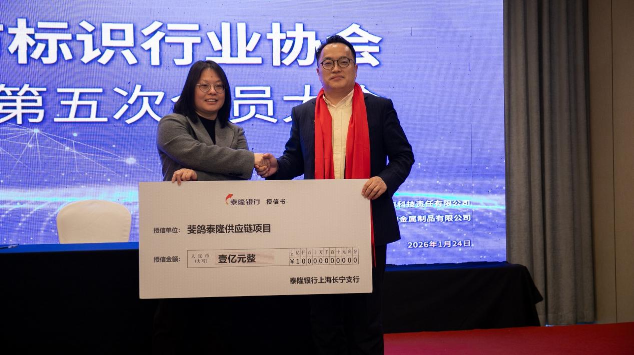 2026年1月24日,在暖意融融的上海市标识行业协会第三届第五次会员大会现场,上海鸽恩科技有限公司旗下品牌斐鴿傳書(以下简写为:斐鸽传书)与浙江泰隆商业银行股份有限公司上海长宁支行(以下简称:泰隆银行上海长宁支行)签署《供应链金融业务战略合作协议》。上海市标识行业协会会长周福生先生、江苏省标识行业协会会长张建平先生等领导出席签约仪式。上海鸽恩科技有限公司董事长、斐鸽传书品牌创始人、上海市标识行业协会数智化专业委员会主任方吉书先生与泰隆银行上海长宁支行行长钱俊女士代表双方签约。